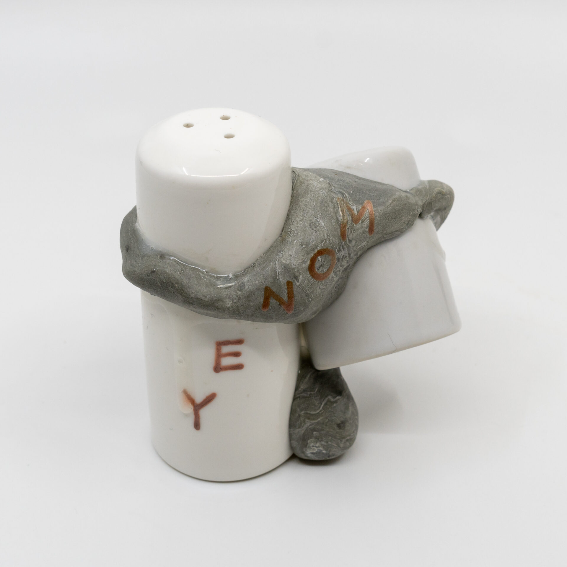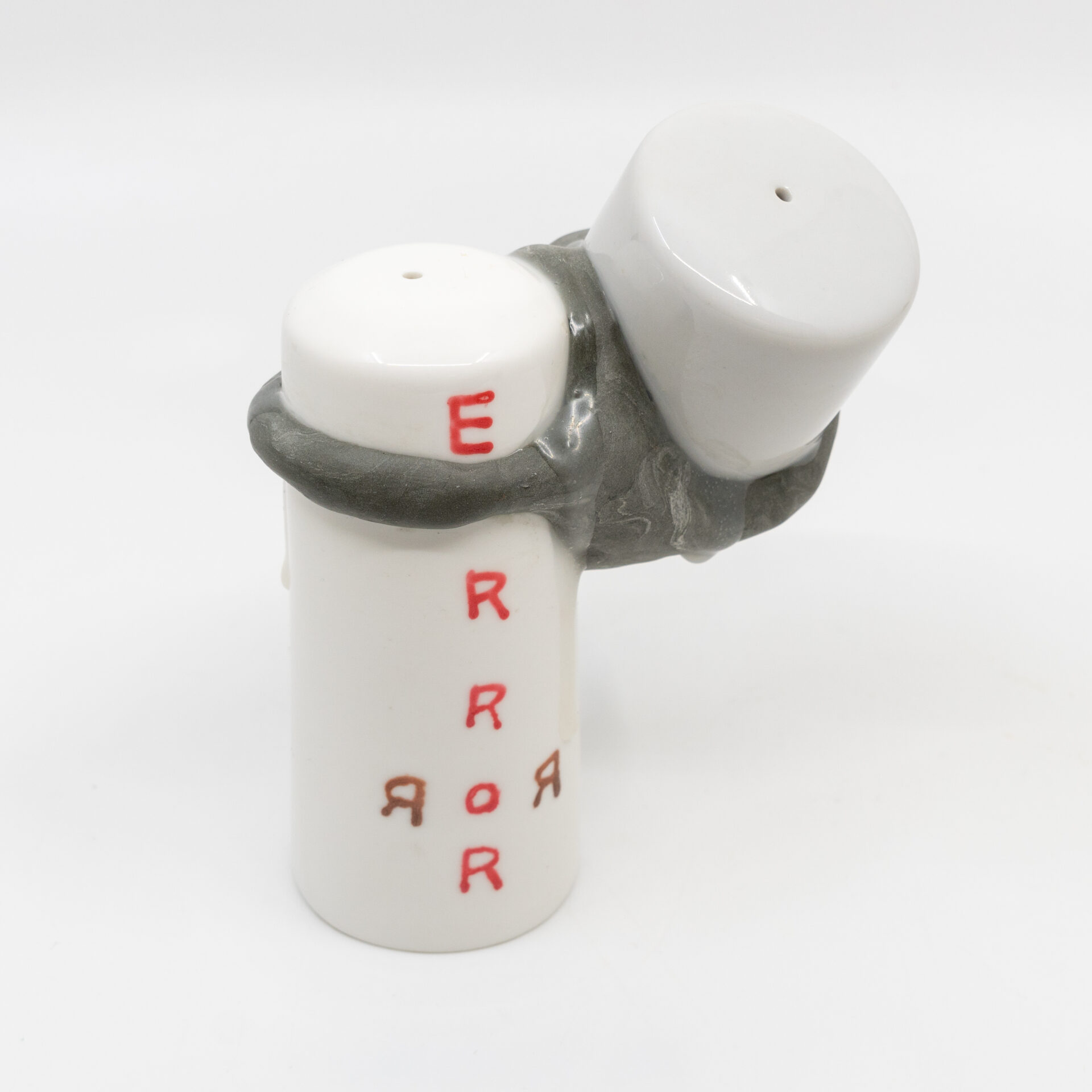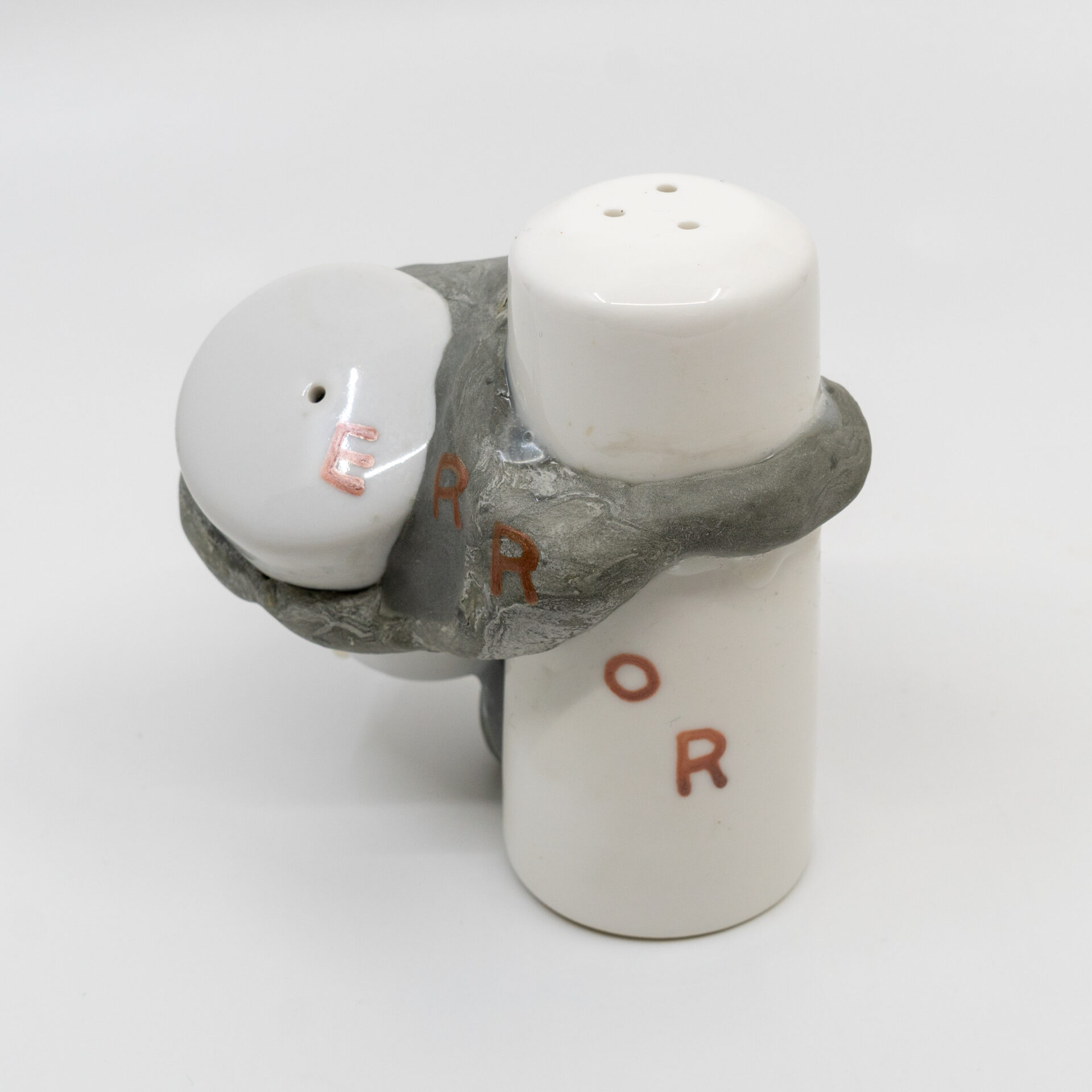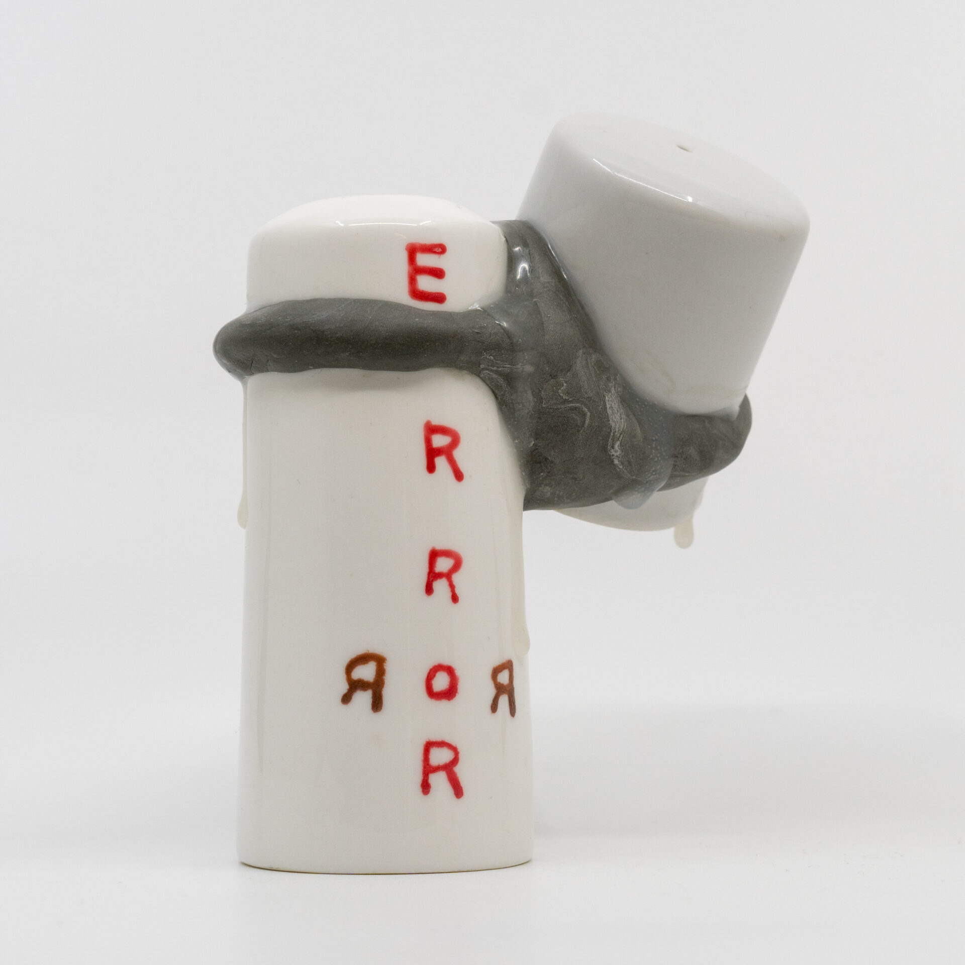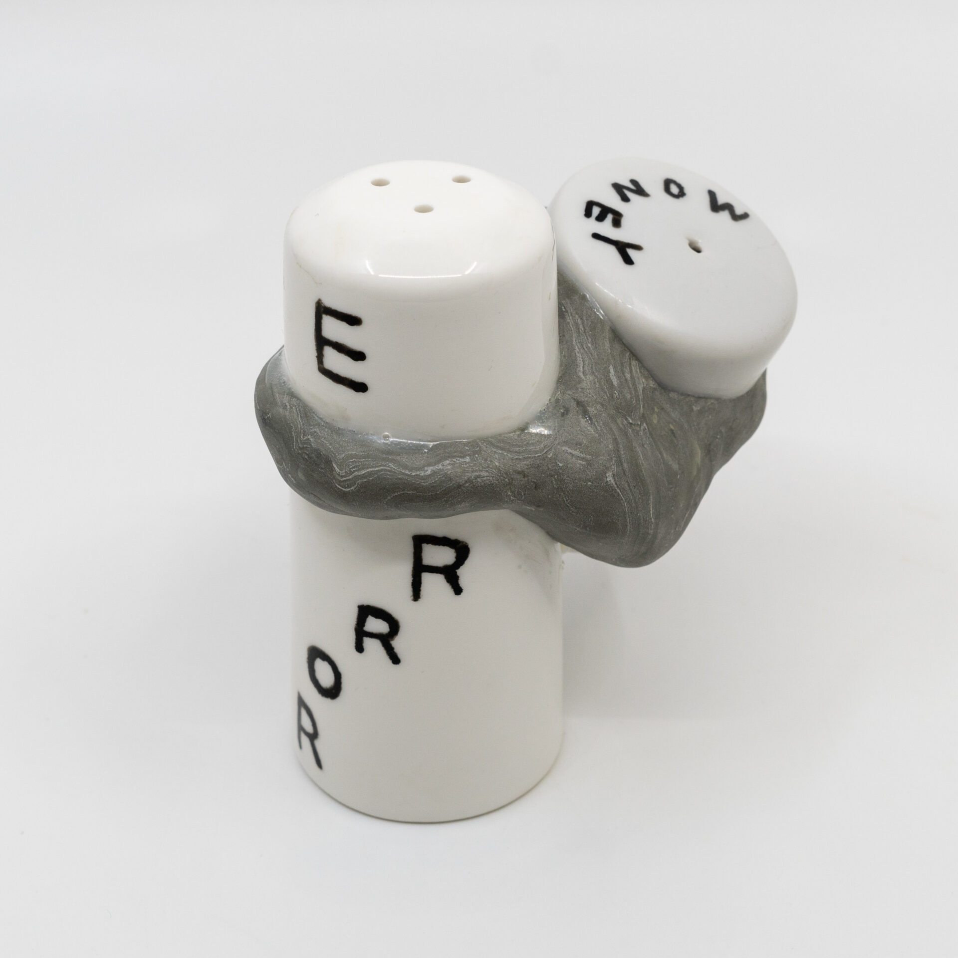 Acest set de solnițe din porțelan, intitulat Error and Money, reprezintă o extensie funcțională a instalației „Error-driven Economy” (2023). Solnițele pot fi utilizate atât ca obiecte practice pentru masa sau bucătăria ta, cât și ca mici sculpturi decorative pentru casa ta. Ele invită la reflecție asupra interacțiunii dintre greșeli și valoare în viețile și sistemele noastre.